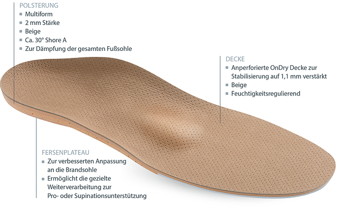 Sie werden brandsohlenseitig in einer Mehrzonentechnik hergestellt. Das Rückfußbauteil aus Multikork stabilisiert, das dämpfende Vorfußbauteil entlastet die Metatarsalen. Das eingebaute Fersenplateau im Rückfuß lässt Freiraum für Pro- und Supinationskorrekturen.