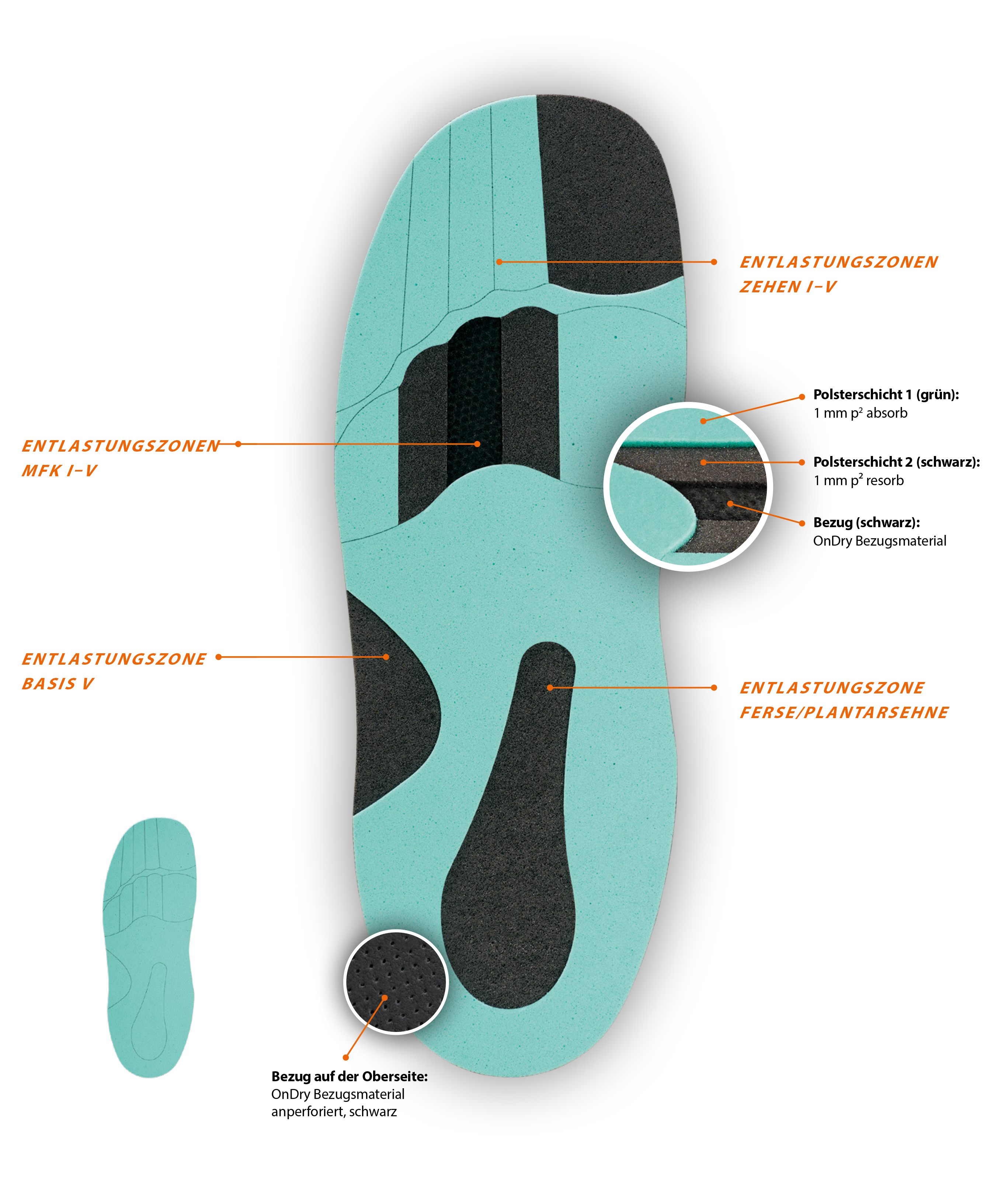 Erwärmen und herauslösenDie Polsterdecke besteht aus zwei PU-Schichten von je 1 mm Dicke und einem OnDry Bezugsmaterial. In der Polsterdecke sind die anatomischen Belastungszonen des Fußes vorgeschnitten. Durch Erwärmen lassen sich hier die einzelnen Materialschichten in den Zonen lösen. So können zur Druckentlastung 1 mm oder insgesamt 2 mm an den erforderlichen Stellen herausgelöst werden.