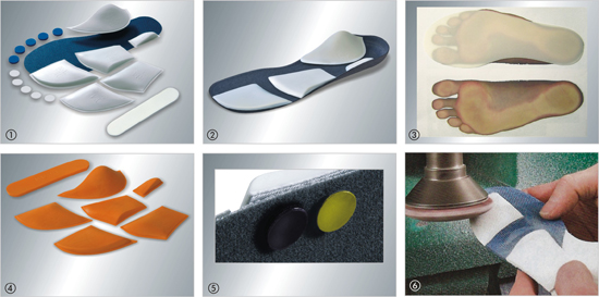 Besides the white elements with approx. 30° Shore A, orange-coloured elements (4) in approx. 45° Shore A can also be ordered. All components can be readily glued and ground. Additional raising elements (5) are available if the insole requires reinforcement at specific points. The transitions, and the height of the individual elements, are worked out individually in the workshop (6).